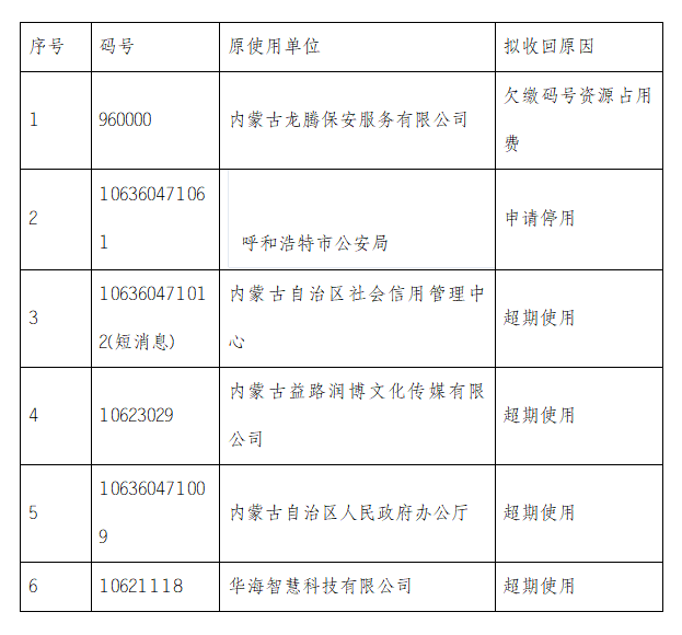 关于拟收回部分电信网码号资源的公示